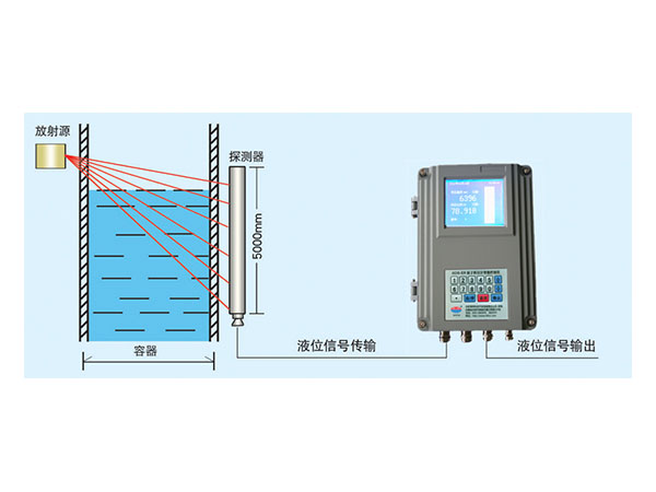 系統概述HDS-EN系列核子料位計利用能量衰減來測量料位。放射源安裝在容器的一側,棒狀探測器安裝在容器的另一側。γ射線穿過容器壁和物料上層空間到達探頭。當物料的料位增加時,到達探頭的能量減少。儀表的電子回路將這種能量的變化轉化為料位的在線檢測。利用這種技術可以獲得高精度的料位讀數和料位變化的快速反應。主要用于多種反應器﹑容器和煤倉中的液體和散狀物料的料位高度。與容器內被測物料物理、化學性質無關,特別適用高壓、強腐蝕、高粘度、結皮、高溫、高粉塵環境。 系統主要技術參數◇ 測量范圍:0-10m;若采用多線程方式,可測量數十米范圍內連續性液(料)位變化。◇ 料位測量精度:≤±3.0%滿量程◇ 時間濾波常數:0-1000s◇ 防爆等級:Exd[ia]ⅡCT6 Gb 防護等級:IP65◇ 接收探測器:采用棒狀閃爍體探測器和電離射線探測器。◇ 儀表線性化:采用對數和多點信號標正。◇ 放射源:采用Cs137或Co60,活度10-8000mCi范圍,活度大小視現場情況而定◇ γ源由特制防護罐進行屏蔽,經衛生環保部門現場檢測符合國家相關安全標準,不會對人體產生損傷,請用戶放心◇ 探測器:輸出0-5V/0-100kHz脈沖料位(液位)信號輸送二次儀表。傳輸距離可達500米。◇ 具有兩路全隔離4-20mA在線連續料位(液位)信號、全隔離4-20mA PID控制輸出。◇ 料位上下超限開關量報警。繼電器觸點容量:250VAC 5A或30VDC 5A。 系統特點:◇ 采用長壽命、高靈敏、高效率的閃爍探測器,探測靈敏,可大大減低放射源的用量,保證環境的輻射安全;◇ 非接觸的設計使在線料位測量系統非常適合在磨蝕、腐蝕、高溫、高壓的環境中應用。◇ 伽瑪輻射技術不受過程參數如壓力、溫度、粘度或密度變化的影響。◇ 高敏感的探測器可以使用小活度放射源達到高測量精度,測量的重復性是探頭量程的1.0%。◇ 采用寬工業級輸入電源模塊,滿足工業現場電源瞬變的需求,新式的穩峰技術確保儀表長期穩定的運行。◇ 采用320*240高分辨率液晶顯示,中文字幕顯示菜單,簡潔明了;在線操作提示,真正實現無紙化在線標定調試操作。◇ 儀表可在線柱狀圖形顯示容器內料位數度值變化,提供瞬時料位變化曲線查詢功能。 核子料位計、液位計工藝現場安裝示意圖