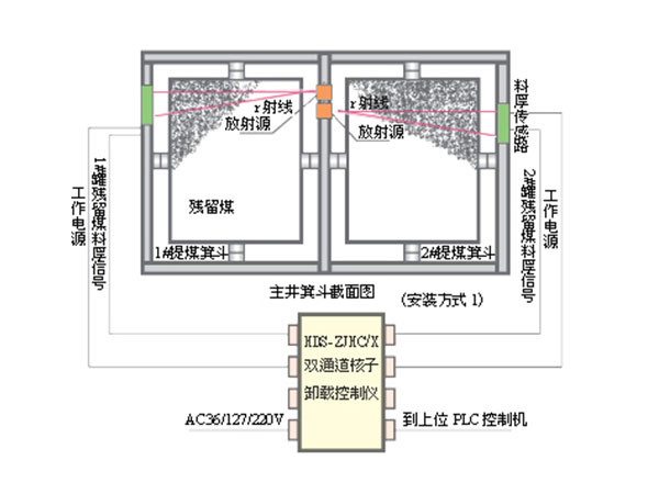 系統結構示意圖 系統設備組成由帶輻射輸出器、屏蔽罐的放射源;射線探測器和固定支架等構成殘留煤厚信號采集部分,由AC127V電源和本安24位單片機等構成控制主機,由本安固態繼電器版、 接線箱等構成料后信號輸出、輸出控制部分。其中放射源經國家環保部門檢測,符《GB4792-84》安全標準,不會對人體產生損傷,請用戶放心!系統工作原理簡述放射源輸出的γ射線穿透機斗鋼板和機斗內卸載后殘留煤,被射線探測器接收,轉換成電信號給控制主機。射線穿透鋼板和殘留煤層時要被部分吸收,被吸收的量與殘留煤層的厚度成一定的對應關系。探測器輸出的電信號強度與殘留煤層的厚度具有一一對應關系??刂苾x主機通過檢測電信號的強度按一定的數學模型、公式,就可得出被測截面卸載殘留煤的厚度,并按設置上、下限值進行遠傳報警輸出。實用性及功能實現◇ 該系統可對主井箕斗卸載進行有效安全控制,以免箕斗重載下放或二次裝載的事故發生?!?控制主機可檢測箕斗被測載面卸載殘留煤的厚度值,按預設的上、下限報警值進行報警?!?給出上位主機PLC的殘留煤厚度報警值,為經繼電器隔離的干接點信號(常開或常閉)。